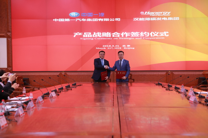 2018年3月21日上午,中国第一汽车集团有限公司(下文简称“中国一汽”)与汉能薄膜发电集团(下文简称“汉能”)签署产品战略合作协议,双方将以“绿色节能”为主题开展全方位战略合作,在未来将凭借双方技术共同研发产品,将汉能薄膜太阳能车顶技术应用到中国一汽红旗系列车型当中,可以延长电动车的续航里程,解决用户在使用过程中的里程焦虑,并结合中国一汽最新的汽车智能网联技术,助力红旗满足消费者对新时代“美好生活、美妙出行”的追求。