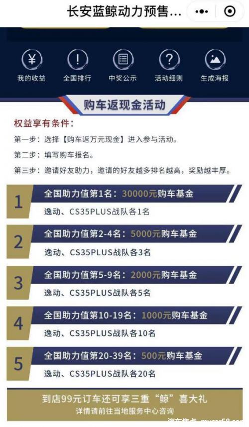 不仅如此,7月26日之前参与“购车返万元现金”和“分享抢百万红包”的预购活动,最高能享受30000元购车基金的现金礼遇,并且还能根据分享助力,获得不等额的现金红包。此外,蓝鲸安全礼&蓝鲸无忧礼还为车主带来了超值福利:获赠一年交强险和首保免费、终身基础保养八折的尊贵待遇。此次长安CS35PLUS蓝鲸版&逸动蓝鲸版的预售活动,综合各类现金和购车政策,可谓诚意满满。
