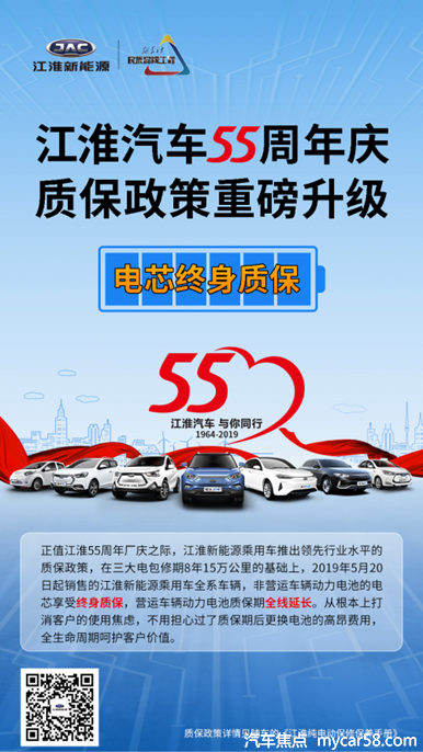 且今年正逢江淮汽车55周年,江淮新能源乘用车推出领先行业水平的质保政策,2019年5月20日起销售的江淮新能源乘用车全系车辆,非营运车辆动力电池的电芯享受终身质保,从根本上打消客户的使用焦虑。
