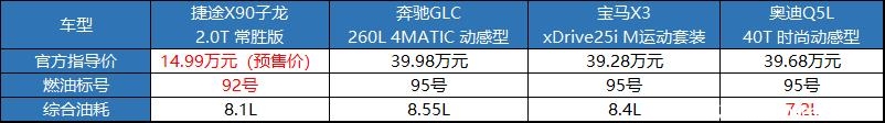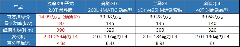 具体来看,与奔驰GLC、宝马X3、奥迪Q5L等动辄接近40万售价的合资豪华品牌车型相比,15万级的捷途X90子龙动力性能全面领先,参数甚至堪比豪华品牌高功率发动机,无疑更具性价比。