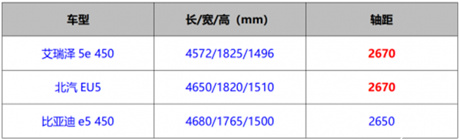 目前市场上的纯电动紧凑型车型产品在尺寸和轴距上基本都是大差不差的水平,这三款车的车身尺寸在同级别中都占据一定优势,尤其2670mm的轴距,可以带来更大的乘坐空间。综合对比,艾瑞泽5e 450的优势更强一些,在车身宽度和轴距上有明显特色。