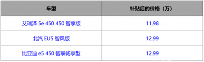 总体来说,艾瑞泽5e 450 、北汽EU5、比亚迪e5 450在外观内饰、智能配置上都有不同特点,艾瑞泽5e 450时尚潮流,智能配置和安全配置都有明显优势;北汽EU5外观则比较大气,动力爆发力强;比亚迪外观虽然偏中规中矩,但实用性也不差。不过,整体比较的话,艾瑞泽5e 450更符合当代消费者对“偶像系实力派”的要求。而且,在国家新能源车补贴新规落地之后,奇瑞新能源顺势推出的保价政策着实让艾瑞泽5e 450 的竞争力再度拉升。在4月1日-6月25日期间购买并上牌车辆的用户,不仅可按照2018年补贴政策购买车辆,还可参与更多“礼遇”优惠。这也能看出奇瑞新能源为满足消费者购车需求所作出的努力。