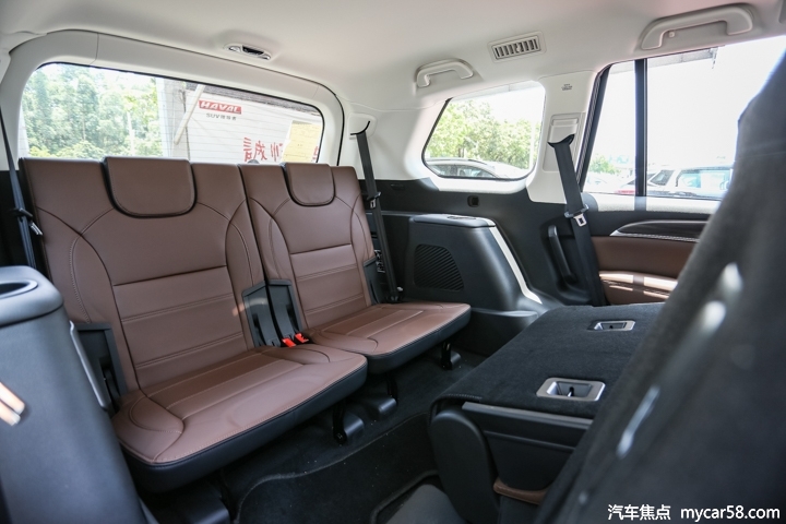 别看哈弗H9的轴距只有2800mm,但由于平直的车顶设计以及后侧窗夸张的面积,坐在第三排也不会感到压抑。当然腿部空间并不会像第二排那么富裕,但应对中短途的出行丝毫没有问题。较长的后排坐垫以及靠背也不会像坐板凳一样,即使成年人也能找到舒适的坐姿。