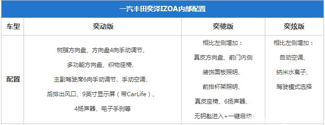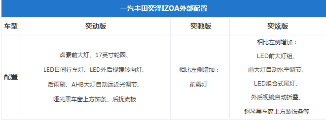 外部配置方面,一汽丰田奕泽IZOA高低配车型在外观方面的配置差距并不算大,低配奕动版和中配奕驰版的主要差别在于前雾灯,而顶配车型则在此基础上配备了全LED前后大灯组、后视镜自动折叠等。