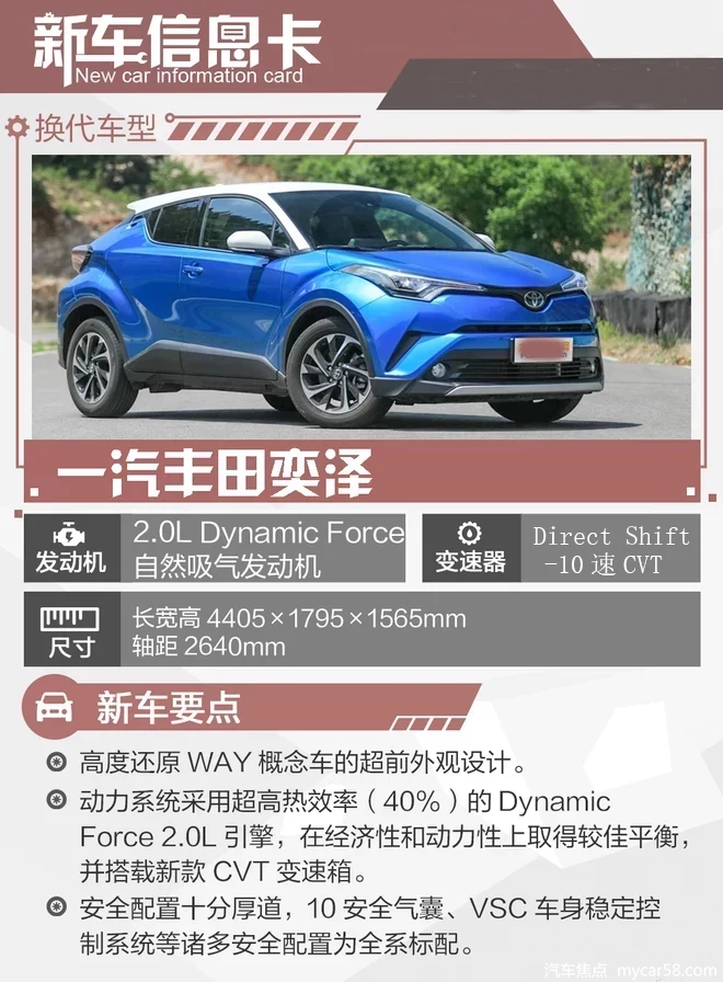 动力方面,该车搭载的是丰田最新的2.0L发动机,这款发动机的最大功率可以达到126kW(171PS)。其压缩比为13:1,热效率高达40%,峰值扭矩可以达到203 N·m。在传动系统方面,该车将匹配丰田最新的Direct Shift-CVT无级变速箱,据悉这款变速箱齿比变化速度比以往增进20%。