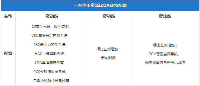 值得一提的是,一汽丰田这次明显是把科技安全配置当成了主打,除了常见的胎压监测、车身稳定控制系统等,10安全气囊(主/副驾驶席、前/后侧气囊、左/右侧气帘、主/副驾驶席膝部气囊)甚至是自适应巡航、车道偏离预警、预碰撞安全系统在新车上都是标配。