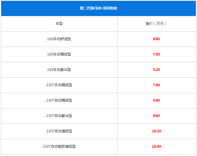 第二代海马S5作为海马汽车产品谱系中的又一款力作,延续其强动力属性并进行进一步完善,此外,第二代海马S5共进行了50项产品升级。包括8项颜值升级,7项配置升级,10项感知品质升级,25项基础质量升级。诸如专业SUV底盘、1.139㎡超大全景天窗、超清360°智能全景影像、moofun移动互联人车生态系统等等配置应有尽有。