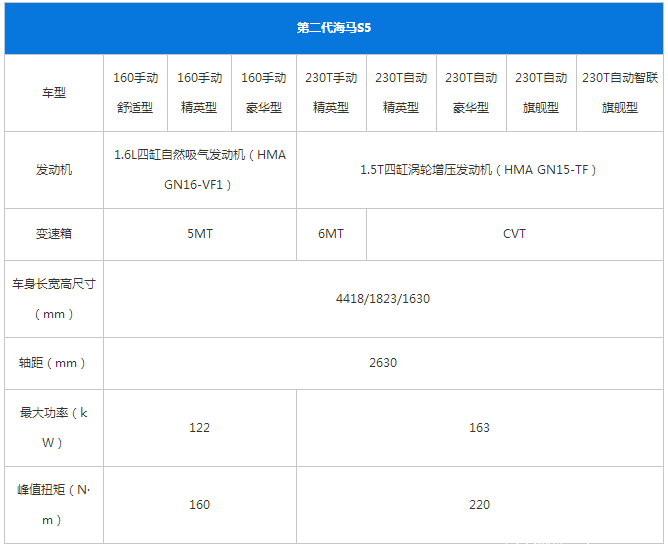 动力部分,第二代海马S5将搭载1.6L、1.5T以及1.6T发动机(年底上市),最大功率分别为90kW(122PS)、120kW(163PS)以及135kW(184PS);传动系统方面,新车将匹配5速手动(1.6L)、6速手动/CVT(1.5T)、以及6速自动(1.6T)变速箱。