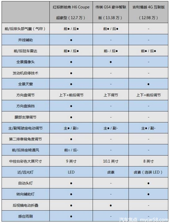 有图有真相,数据更能展现差距。与售价13.38万的传祺GS4豪华版相比,新哈弗H6 Coupe也毫不示弱,增加了全景天窗、LED大灯、360环视影像、方向盘换挡、智能启停、座椅通风、腰部支撑、感应雨刷等多项实用配置,大大提高了行车安全与舒适度。在配置丰富程度上,新哈弗H6 Coupe更是秒杀吉利博越。