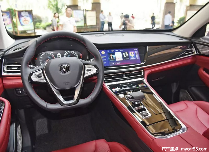 内饰上长安CS85中控台区域采用T字形造型,中控台与车门板护板上采用了大量的软质材料包裹,大尺寸的液晶显示屏和中控大屏的加入,豪华感提升了不少。三幅式的多功能方向盘和黑曜石晶钻设计的游艇式换挡手柄,将整车内饰豪华氛围推向了极致。