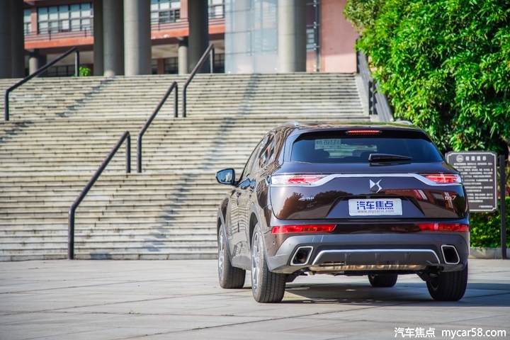 来到车尾,DS 7营造出十分夸张圆润感,通过较高的后保险杠设计提升整个车尾的视觉高度,细长扁平的尾灯通过镀铬饰条相连接来营造出更宽的车身效果。值得一提的是DS 7的双边共双出排气布局都是真的排气口,毕竟作为一台售价不低的豪华车型,这样的“面子”设计也是必须的。
