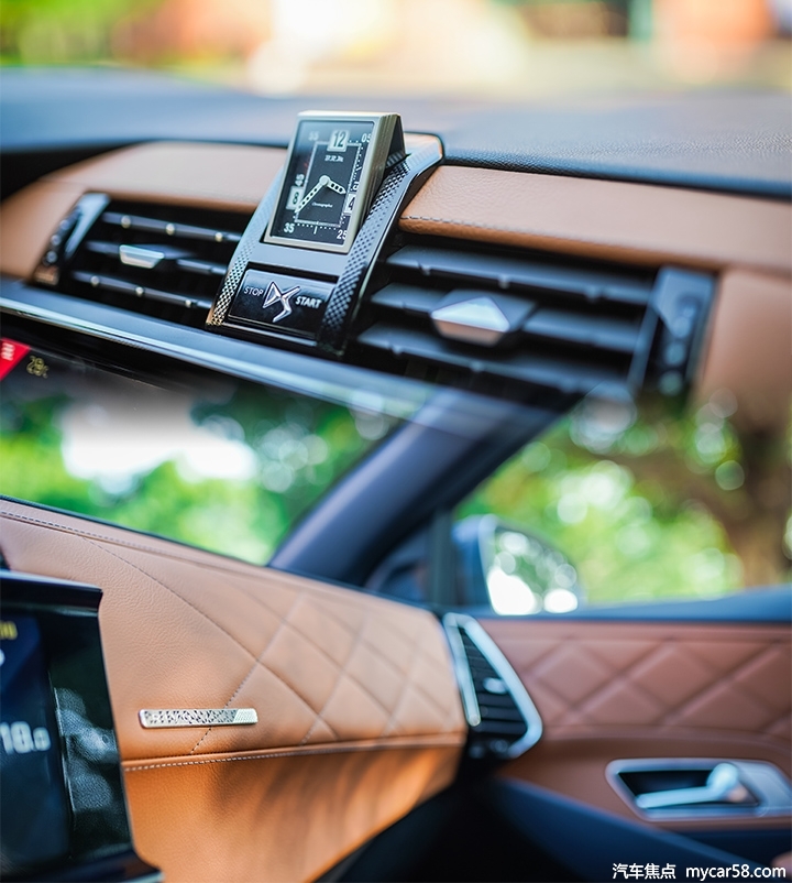 DS 7的一键启动按键设置在空调出风口的位置上,在车辆启动后中间的时钟会自动翻起,来自法国B.R.M专门定制的时钟充满轻奢的感觉。在不同版本的DS 7车型上内饰的用料也有所不同,试驾车中控台采用了大量Claudia真皮覆盖,菱形图案灵感来源与Rivoli大街,精致奢侈的氛围仿佛艺术品般精美。