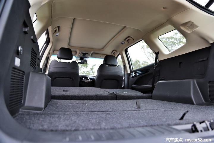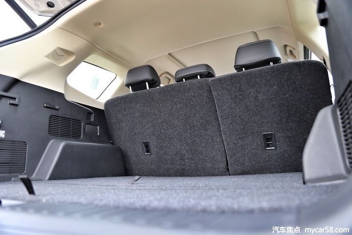 捷途X90的后备箱相当工整,宽大的轮胎并没有过多的压缩后备箱空间,这点非常意外。5座版车型放倒后排座椅后储物空间更夸张,纵深距离目测已经达到1.8米,如果后排座椅放倒后能达到100%全平,那就更完美了。