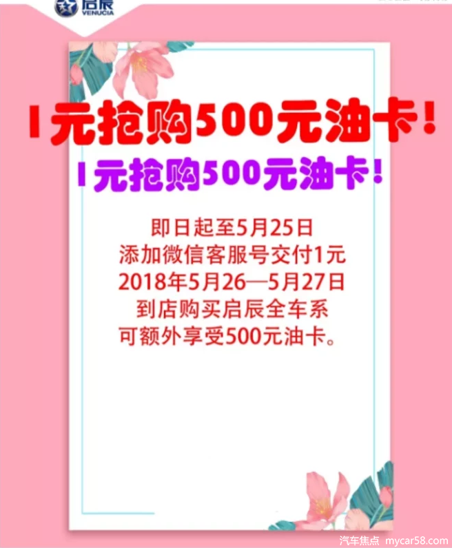 交付1元,5月26-5月27日到店购启辰任意车型即可额外享受500元油卡。