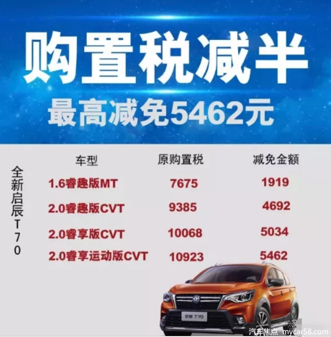 购买启辰T70可享50%购置税优惠,最高可省5462元