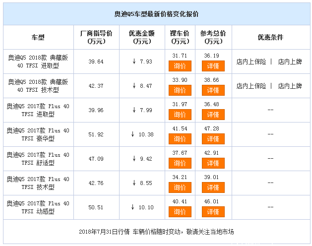 近日,本店内有奥迪Q5销售,颜色可选,目前购车部分车型可优惠10.38万元,感兴趣的朋友可以到店咨询购买,详情见下表: