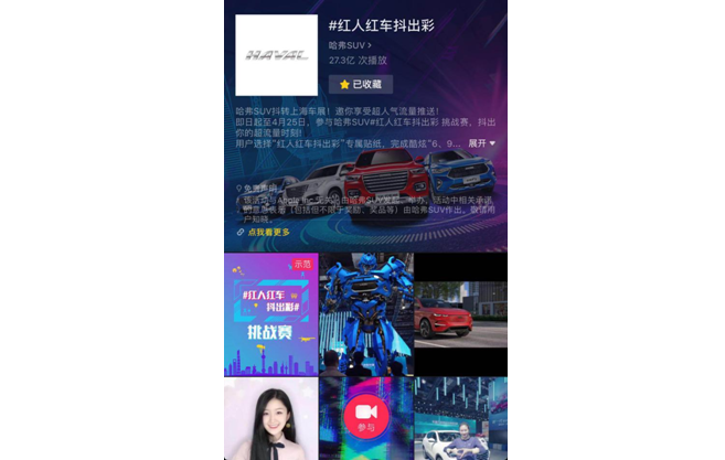 什么样的活动能造就如此盛况,吸引这么多人围观?哈弗#红人红车抖出彩 抖音挑战赛,再度成为哈弗引爆的燃点,在上海车展这种目不暇接的汽车盛会期间,变身“流量王”。从数字层面来看,截止到目前,哈弗抖音挑战赛至少有26万用户投稿产出36万支精彩视频,吸引超过6745万次点赞,累计获得27.3亿播放量,这一数字要多于全球1/3人口数量,关注度可见一斑!而惊人的数据背后,我们更应该看到,这场挑战赛在完成哈弗品牌推广的同时,更强化了哈弗年轻、流行的品牌形象,成功助力哈弗品牌年轻化升级,为汽车品牌短视频营销之道树立业界标杆。
