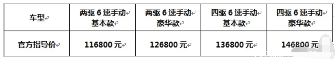 新车率先推出四款车型,包含两驱和四驱版本,并提供7种车身颜色,官方售价为11万-14万元,全面满足广大消费者的个性化需求。具体车型信息如下: