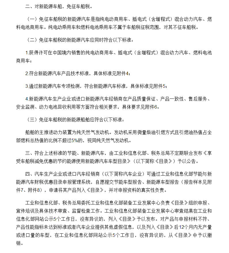 三、符合上述标准的节能、新能源汽车,由工业和信息化部、税务总局不定期联合发布《享受车船税减免优惠的节约能源使用新能源汽车车型目录》(以下简称《目录》)予以公告。