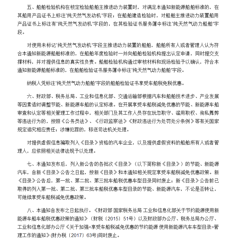 六、财政部、税务总局、工业和信息化部、交通运输部根据汽车和船舶技术进步、产业发展等因素适时调整节能、新能源车船的认定标准。在开展享受车船税减免优惠的节能、新能源车船审查和认定等相关管理工作过程中,相关部门及其工作人员存在玩忽职守、滥用职权、徇私舞弊等违法行为的,按照《公务员法》、《行政监察法》《财政违法行为处罚处分条例》等有关国家规定追究相应责任;涉嫌犯罪的,移送司法机关处理。