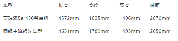上述对比不难看出,艾瑞泽5e 450的车身尺寸在同级别领先车型中也十分突出,尤其超过1.8米的车身宽度直逼B级车,可以塑造更丰富多元的空间布局。