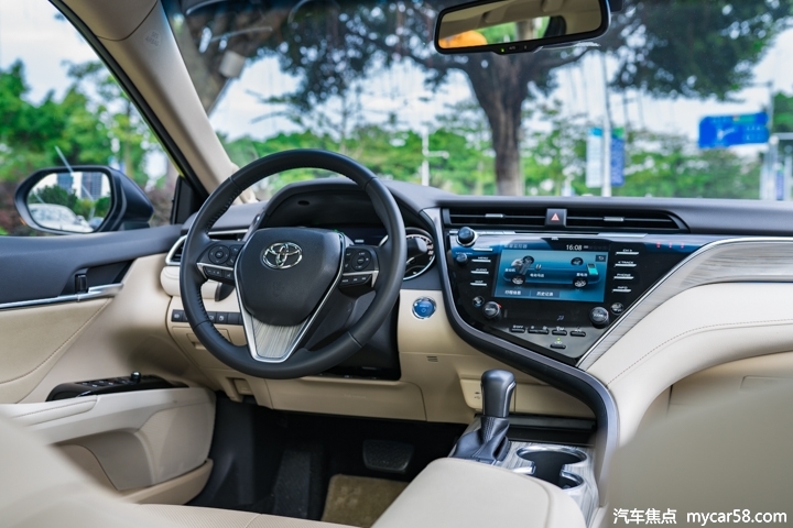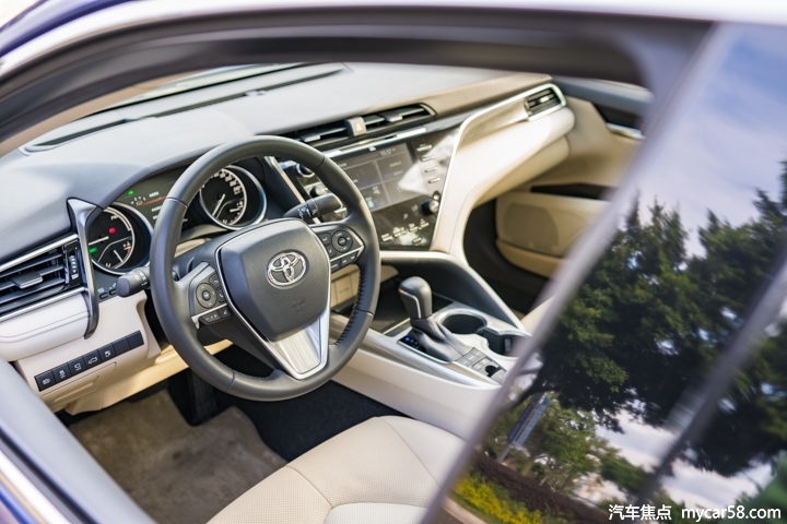 内饰依然采用不对称的Y型中控台设计增强视觉效果,试驾车型上的米色内饰加上浅色木纹饰板的组合形成很不错的精致感,时隔半年再次接触到第八代凯美瑞依然是新鲜感十足,并且质感表现与同级别的日系厂商车型还略有优势。