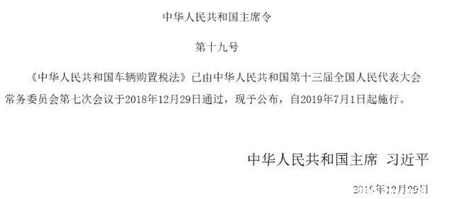 2018年12月29日,第十三届全国人民代表大会常务委员会第七次会议通过了《中华人民共和国车辆购置税法》(以下简称:《车辆购置税法》),该法将于2019年7月1日起实施,与此同时,已实行了约18年的《中华人民共和国车辆购置税暂行条例》(以下简称:《暂行条例》)将废止。