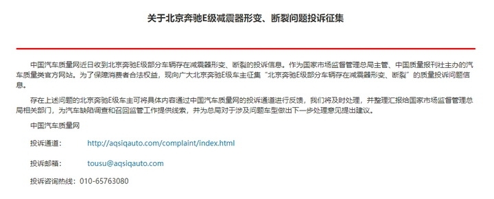 奔驰E级减震器“断裂门”爆发:中国汽车质量网征集投诉
