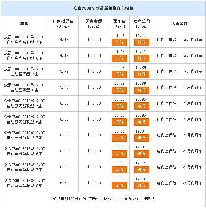 近日,本店内有众泰T800销售,颜色可选,目前购车部分车型可优惠0万元,感兴趣的朋友可以到店咨询购买,详情见下表: