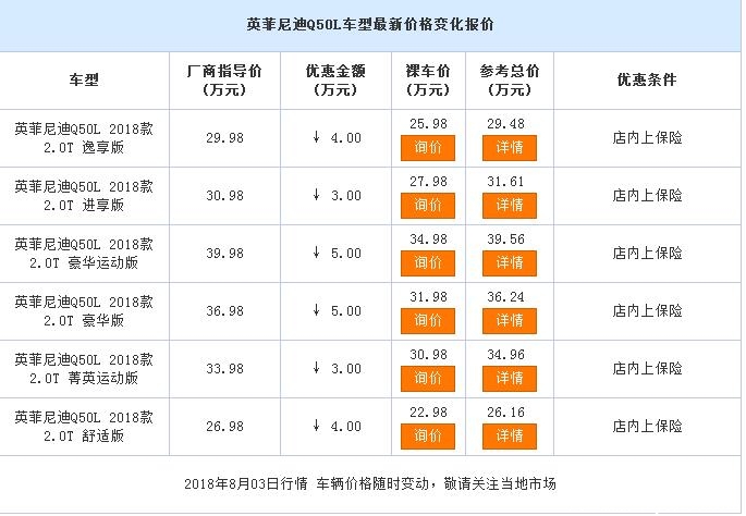 近日,本店内有英菲尼迪Q50L销售,颜色可选,目前购车部分车型可优惠3.00万元,感兴趣的朋友可以到店咨询购买,详情见下表: