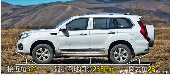 说到越野就不得不提车辆的通过能力,H9的接近角为32°,离去角28°,最小离地间隙为235mm,在同级具有不错的通过性。