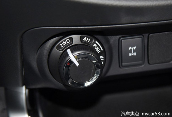 途达采用了简单直接的分时四驱系统,100km/h内通过中控旋钮可调节驱动模式,低速四驱下扭矩可放大2.7倍,后桥配备了牙嵌式差速锁,轮间同样有电子限滑,脱困能力强大。这套分时四驱的特点就是结构简单,可靠性强,但是对驾驶技术有一定要求,尤其是硬链接在铺装路面上高速转弯容易对分动箱、差速器、传动轴造成损害,因此越野过后需要及时换回2WD模式,不可以随意撒野。