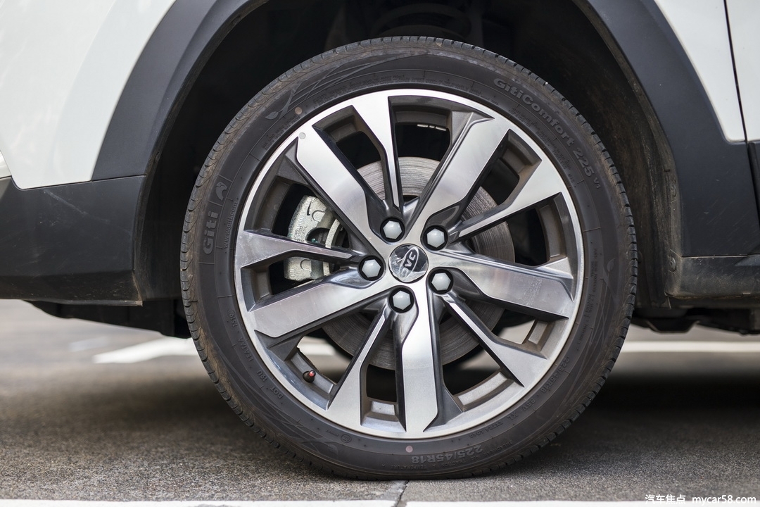 18寸大轮毂搭配在小型SUV身上显得更加具有冲击力,江淮iEVS4这款轮毂相当耐看,超薄的运动轮胎运动感也足够强烈。轮胎参数方面为225/45 R18,根据配置不同分别采用了米其林和佳通的品牌轮胎。