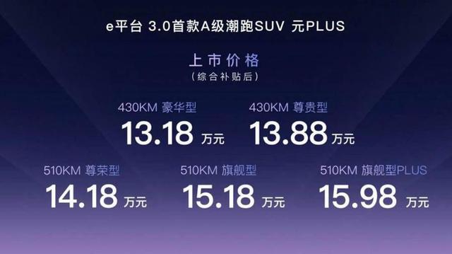2月19日,比亚迪e平台3.0首款A级潮跑SUV——元PLUS正式上市,新车共5款车型,官方指导价13.18万元——15.98万元,并推出五大专享礼遇。