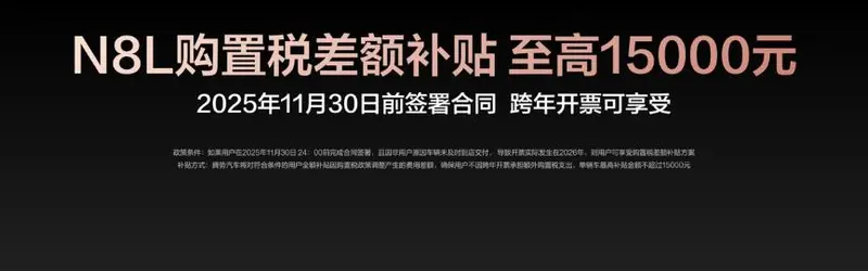 为回馈广大用户的支持与信赖,腾势N8L特别推出限时购车权益,权益价值至高10.67万元!包括价值1.7万元的三年免息,最高1万元的置换补贴。此外,不必担心因为交车晚,享受不到购置税补贴:在2025年11月30日24点前完成合同签署的用户,如果因非用户原因车辆未及时交付,导致开票实际发生在2026年,可享受购置税差额补贴,最高1.5万元!