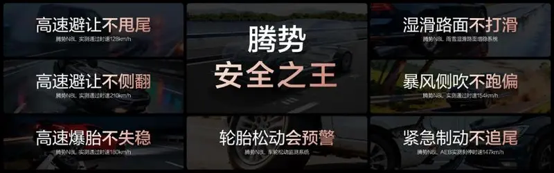 主动安全方面,得益于易三方,腾势N8L能够以128km/h高速避让不甩尾、210km/h高速避让(鱼钩测试)不侧翻、180km/h高速爆胎不失稳、154km/h暴风侧吹不跑偏、147km/h AEB自动紧急制动、不怕雨雪路面打滑、车轮松动监测系统,以科技安全守护家人出行安心。腾势汽车不愧被称为新能源汽车的“安全之王”。