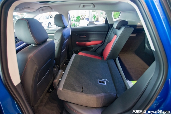实拍车型上采用一套红黑拼色的座椅设计,运动感相当不错。得益于全景天窗带来更加宽敞的开扬感,后排乘客并不会感到压抑。后排腿部空间的表现并不算奢侈,但也能满足日常家用需求,宽厚的座椅配合较长的坐垫对于腿部的支撑带来不错的舒适感。