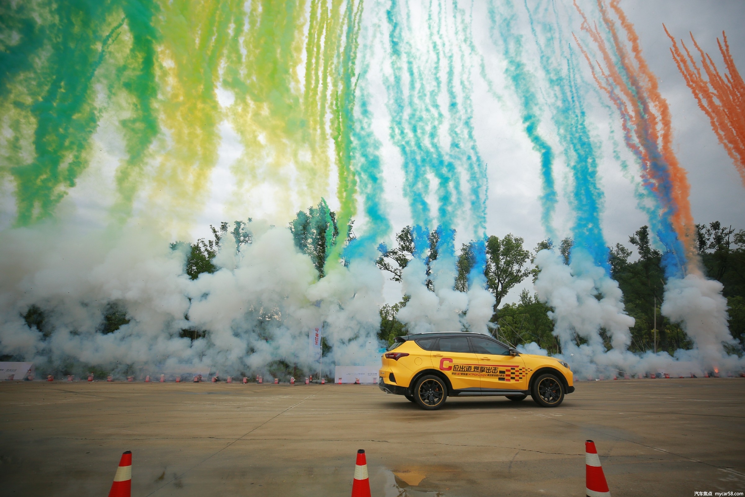 此次捷途X70Coupe潮劲体验营现场,最让人心潮澎湃的环节莫过于彩烟飞车,巨型彩烟不仅颜色亮眼,喷射速度更是直冲云霄。当然,捷途X70Coupe也毫不逊色,搭载获得“中国心”荣誉的奇瑞第三代ACTECO1.6TGDI发动机,最大功率145kW,峰值扭矩290N·m,同时匹配7速双离合变速箱的黄金动力组合,动力性能同级领先,不仅能为驾驶者提供高效的动力,也利于节油减排,有利环保。在8.9秒速度挑战中,动力输出强劲稳定,与彩烟共同倾力打造出了“全国首例车与烟的速度与激情”。