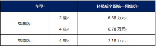 6月12日,随着新能源补贴新政正式实施,新政对续航能力和电池能量密度有了更严格的要求,奇瑞新能源顺势推出越级续航车型奇瑞eQ1小蚂蚁 400,6月28日正式开启预售,补贴后6.58万起。预售的小蚂蚁 400共推出了智享版、智炫版两种版型,补贴后售价公布如下: