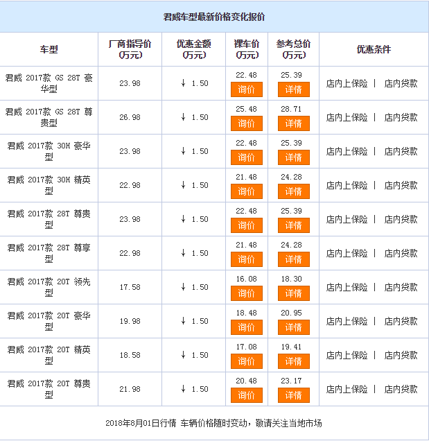 近日,本店内有君威销售,颜色可选,目前购车部分车型可优惠1.50万元,感兴趣的朋友可以到店咨询购买,详情见下表: