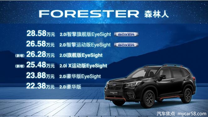 新款森林人,是在斯巴鲁“驾驭硬实力”品牌口号的基础上升级推出的产品,也是斯巴鲁努力为用户带来安心与愉悦驾乘体验的集大成之作。它不仅仅是一台可以从容应对不同路况的强大SUV,更是您和家人出行的安全守护。斯巴鲁对FORESTER森林人全系车款进行了改款并增加了两个FORESTER森林人系列车款,2.0i X运动版EyeSight及2.0i旗舰版EyeSight,新车市场指导22.38万元-28.58万元。