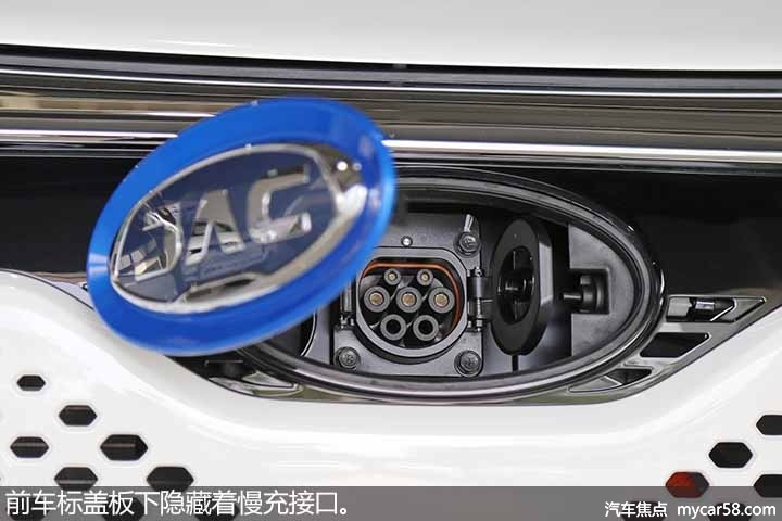 江淮iEV7L外观延续了江淮新能源家族式设计,标志性的宝瓶口设计辨识度十足,六边形蜂巢式前进气格栅融入镀铬处理的格栅边框,与自家其他几款兄弟产品有着很强的一致性。带有蓝色装饰的品牌logo也表明了它新能源汽车的身份。