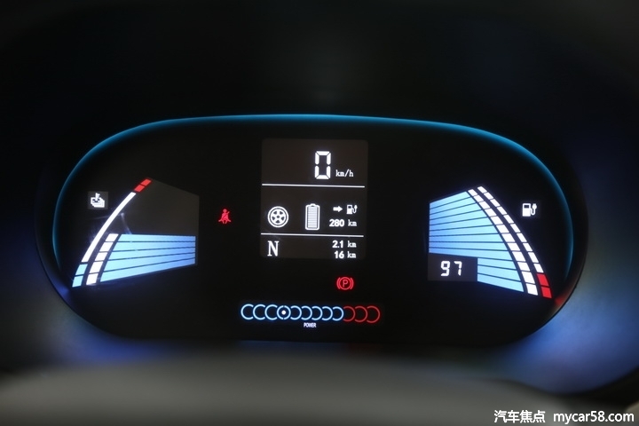 仪表盘采用三块液晶屏幕组成,左侧为电池温度,右侧为电量,中间部分则可显示速度、续航数据以及里程信息等;底部的圆圈则为实时的充/放电、能量回收状态条。