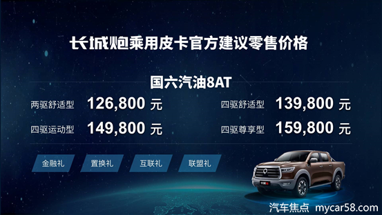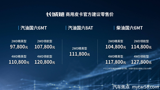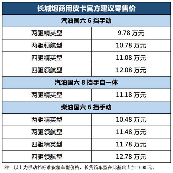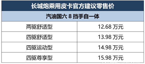 其中,长城炮乘用皮卡官方建议零售价区间为12.68-15.98万元,全系搭载2.0T汽油国六发动机,匹配8挡手自一体变速器;长城炮商用皮卡官方建议零售价区间为9.78-12.88万元,包括汽/柴油发动机、8挡手自一体/6挡手动变速器、两驱/四驱、标准货箱/长货箱、精英型/领航型共17个版本供消费者选择。
