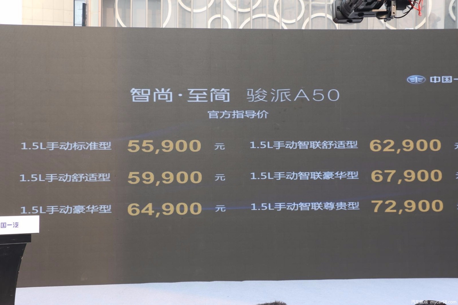 2018年3月11日,“智尚·至简”天津一汽骏派A50上市发布会同一天在山东济南拉开帷幕。此次发布的新车型包括标准型、舒适型、智联舒适型、豪华型、智联豪华型、智联尊贵型共6款,均搭载1.5L自然吸气发动机,匹配5速手动变速器。