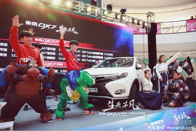 发布会现场,劲歌热舞、王者荣耀cosplay、快闪、游戏互动、佩奇纹身,吸睛无数。快闪舞蹈惊喜揭幕,东南DX7 Prime正式亮相。