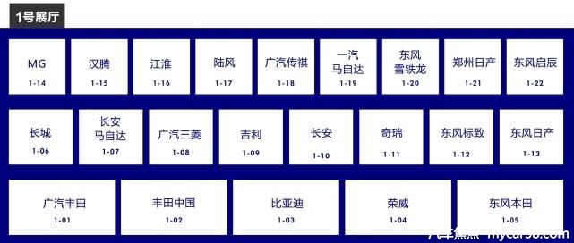 1号馆:东风本田、荣威、比亚迪、丰田中国、广汽丰田、东风日产、东风标致、奇瑞汽车、长安汽车、吉利汽车、广汽三菱、长安马自达、长城汽车、东风启辰、郑州日产、东风雪铁龙、一汽马自达、广汽传祺、陆风汽车、江淮汽车、汉腾汽车、MG汽车、海马新能源、长安新能源、北京汽车、东风风神等。