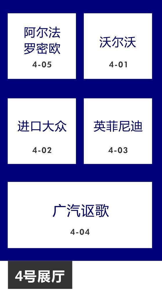 4号馆:广汽讴歌、英菲尼迪、进口大众、沃尔沃、阿尔法罗密欧、福建奔驰等。