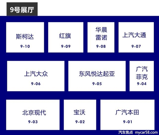 9号馆:广汽本田、宝沃汽车、北京现代、广汽菲克、东风悦达起亚、上汽大众、上汽大通、华晨雷诺、红旗、斯柯达、云度汽车等。