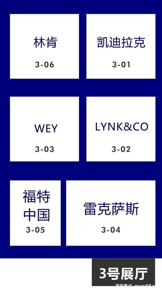 3号馆:雷克萨斯、福特中国、领克LYNK&CO、WEY汽车、凯迪拉克、林肯等。